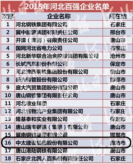 近日,由河北省工業經濟聯合會主辦,省企業家協會、省企業聯合會和省統計學會協辦的2015年河北百強企業排序活動圓滿落幕,經層層評選審核、專家評審和社會公示等程序,最終揭曉結果。中太建設集團再次榮膺“河北百強企業”(第16名),并在“河北省重點行業排頭兵企業”排名中榮獲建筑業第1名。