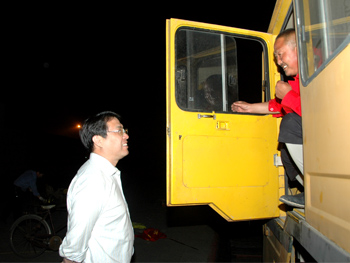 5月16日深夜,省建設廳副巡視員梁軍來到石家莊鐵路東貨場,慰問即將奔赴四川地震災區的河北建設搶險隊押車隊員。