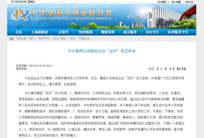 全國(guó)工商聯(lián)網(wǎng)站8月19日?qǐng)?bào)道了中太建設(shè)集團(tuán)制定出臺(tái)“五好”員工標(biāo)準(zhǔn)