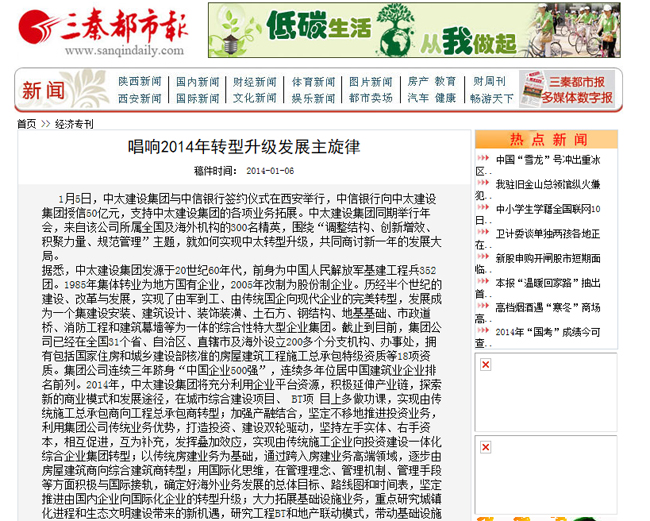 三秦都市報報道了中太建設集團唱響2014年轉型升級發展主旋律