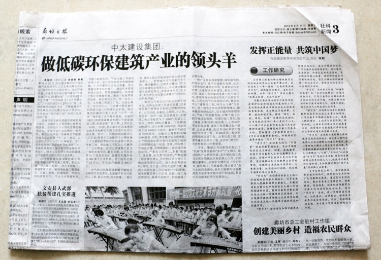 廊坊日報三版頭條報道了中太建設集團做低碳環保建筑產業的領頭羊