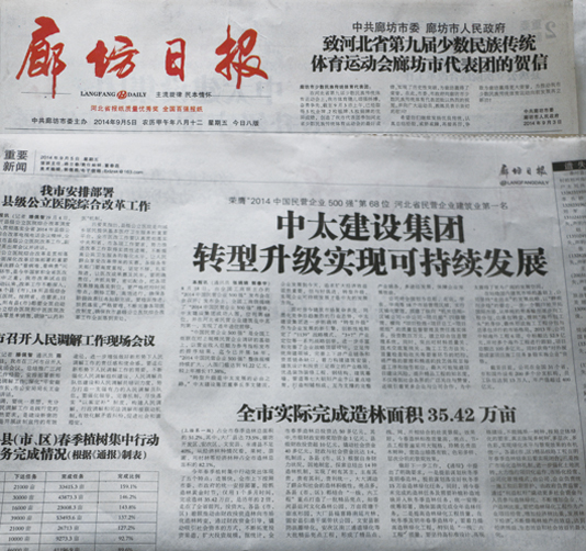 9月5日廊坊日?qǐng)?bào)報(bào)道了中太建設(shè)集團(tuán)轉(zhuǎn)型升級(jí)實(shí)現(xiàn)可持續(xù)發(fā)展