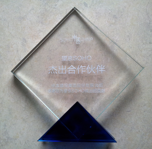 日前,soho中國有限公司向中太建設集團頒發“望京soho杰出合作伙伴”獎杯,以感謝集團公司在建設望京soho過程中給予的巨大支持,同時送上一張望京soho實景照片。soho中國有限公司董事長潘石屹在照片上親筆寫道:“您的汗水和努力,創造了這座建筑奇跡!”