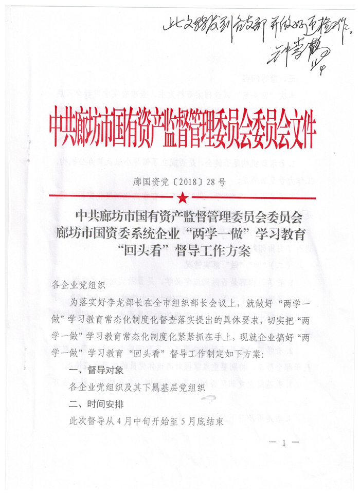 現將中共廊坊市國資委黨委制定下發的《廊坊市國資委系統企業“兩學一做”學習教育“回頭看”督導工作方案》(廊國資黨[2018]28號)文件轉發給你們,請嚴格按照文件要求,認真抓好落實,切實把“兩學一做”學習教育常態化制度化抓實抓好。各支部自查與準備工作情況匯報務于4月18日前報黨群文化中心(黨辦室)。